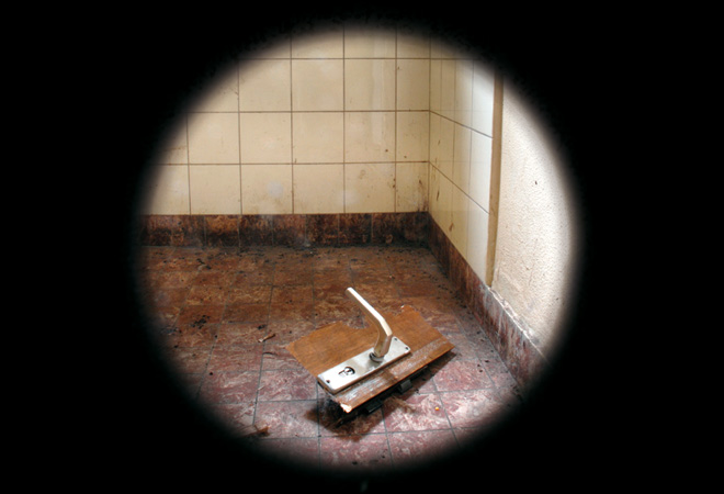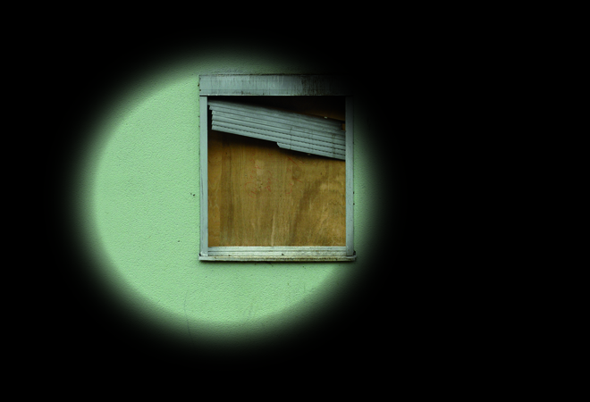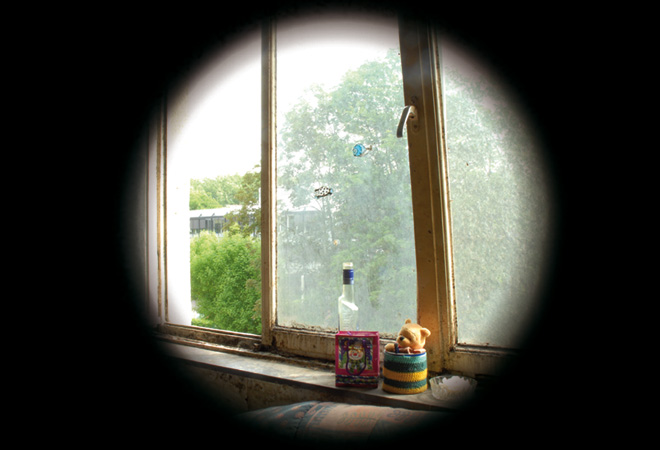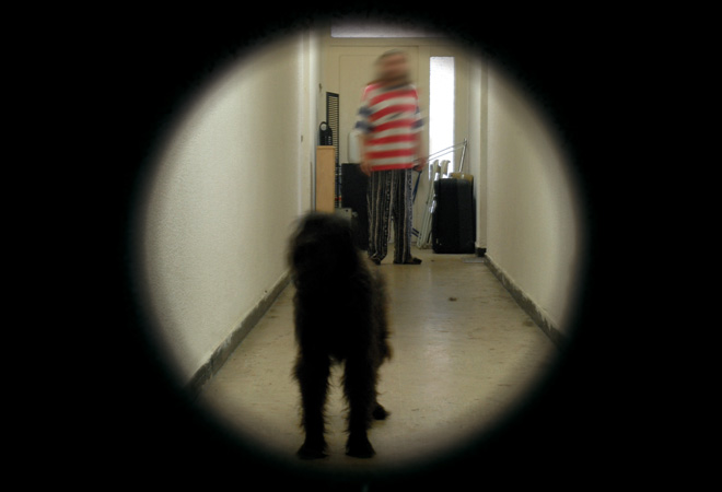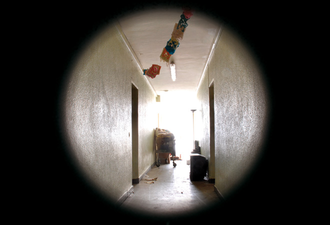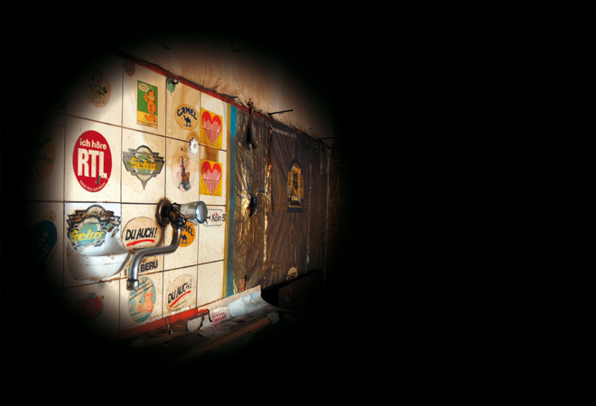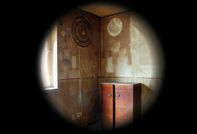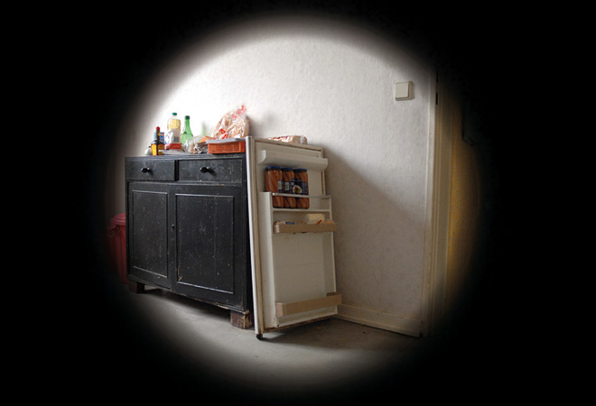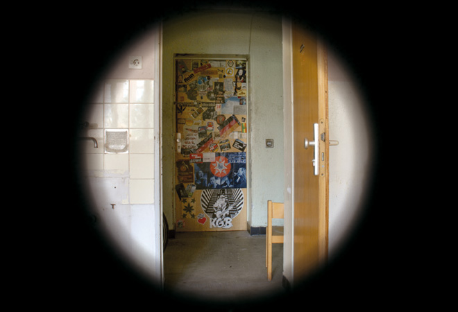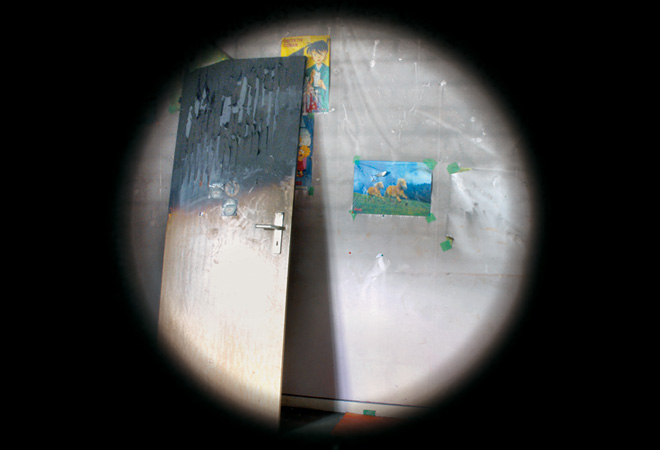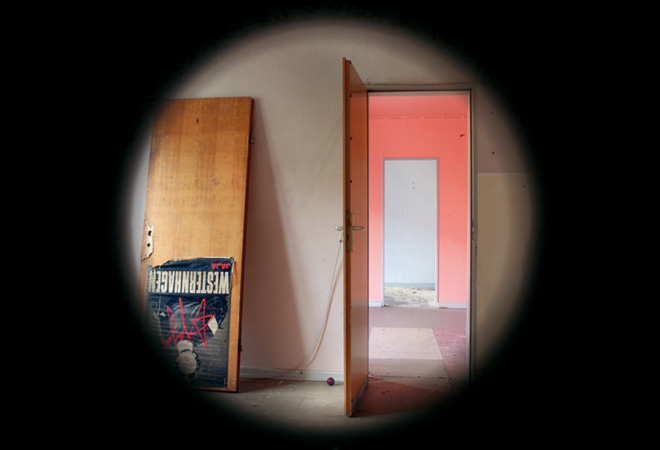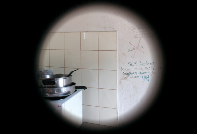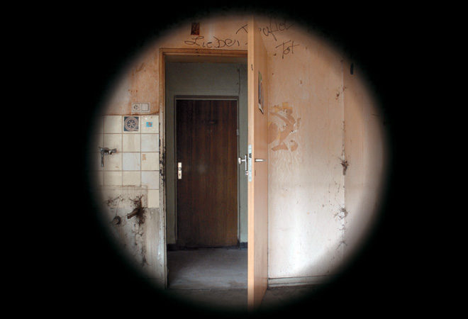 Ein Flur in einem ehemaligen Wohnheim für Aussiedler wird zum Ausstellungsort. Die Türen sind mit Spionen versehen, die einen vermeindlichen Blick ins innere der Räume preisgeben. Hinter den Türspionen sind jedoch Leuchtkästen mit Fotos angebracht. Der Besucher wird zum Voyeur und erlebt Wohnsituationen, die für den »Normalbürger« jenseits des zumutbaren wohnens liegen.